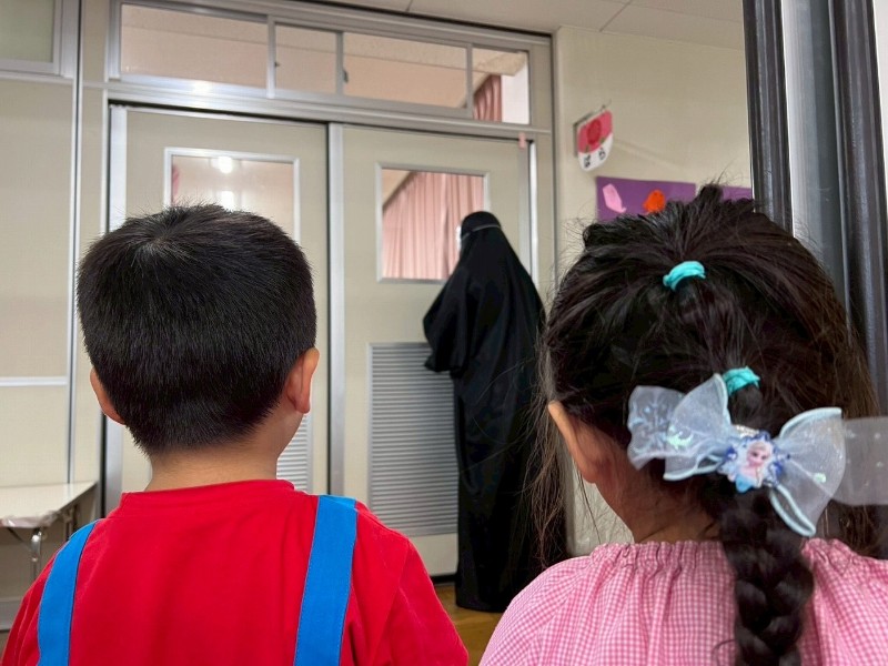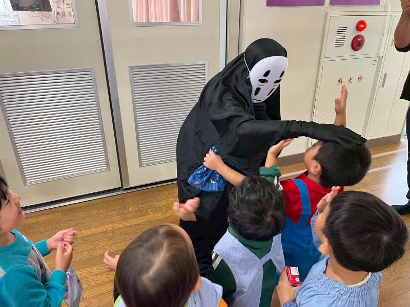お昼ご飯を食べていたら…どこからともなく、カオナシさんが来園(笑)お隣のクラスを覗いているカオナシさん!後ろから真剣に見ている子どもたちが、なんとも可愛い姿です。