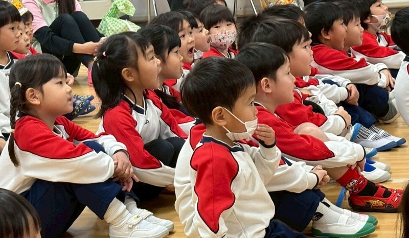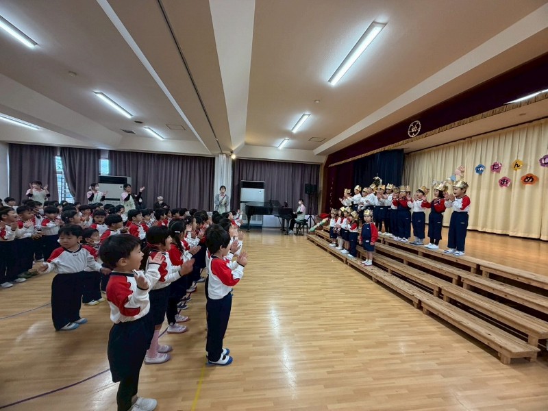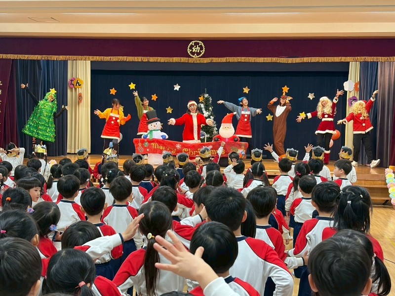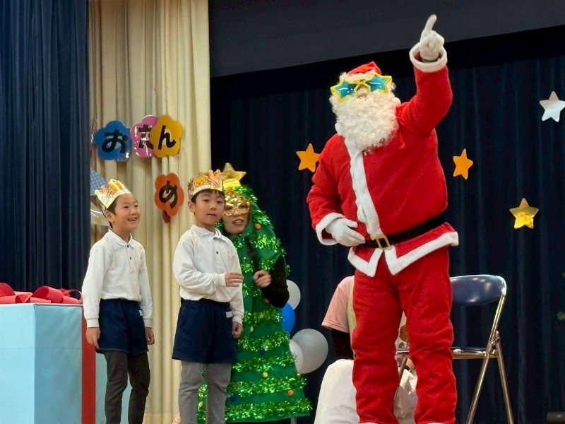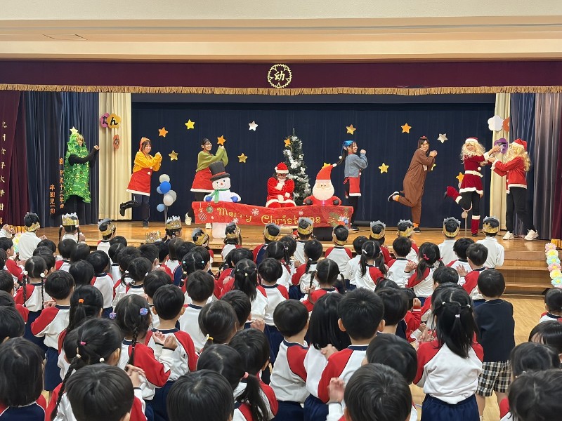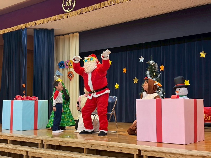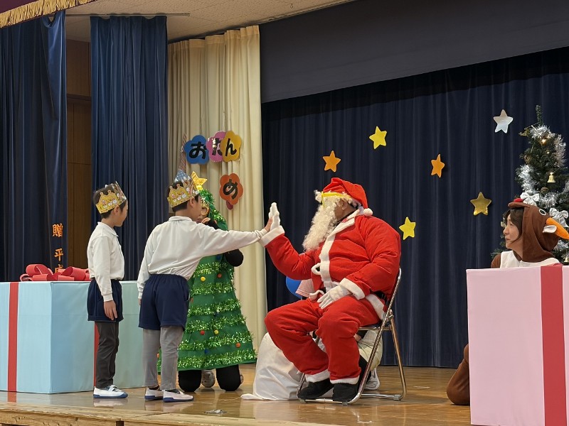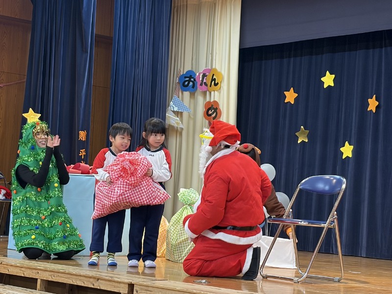なんと!サンタクロースが来てくれました。質問をしたり、プレゼントをもらって一緒に写真撮影もしましたよ。サンタさんは大忙しなので、名残惜しいのですが「ばいばーい」と元気に手を振ってお別れしました。サンタさん!よいこの折尾幼稚園の子どもたちに会いに来てくれて「ありがとう!!」