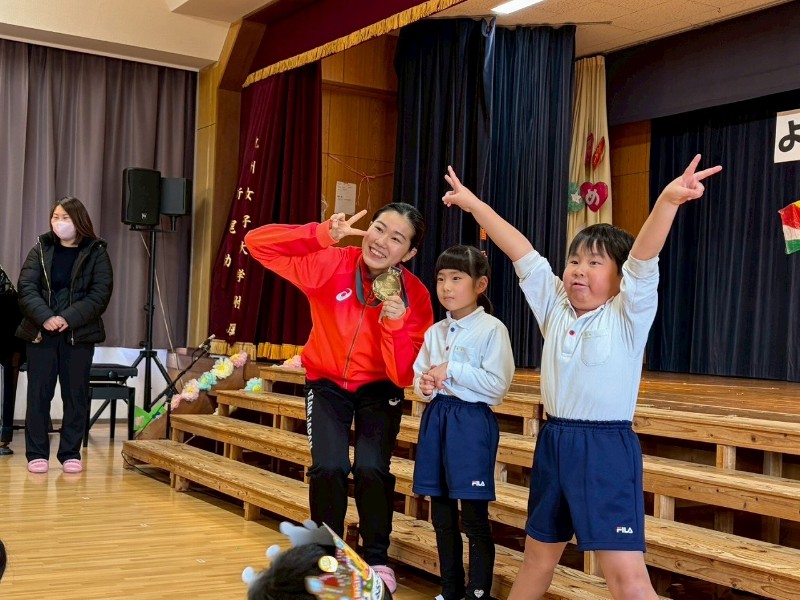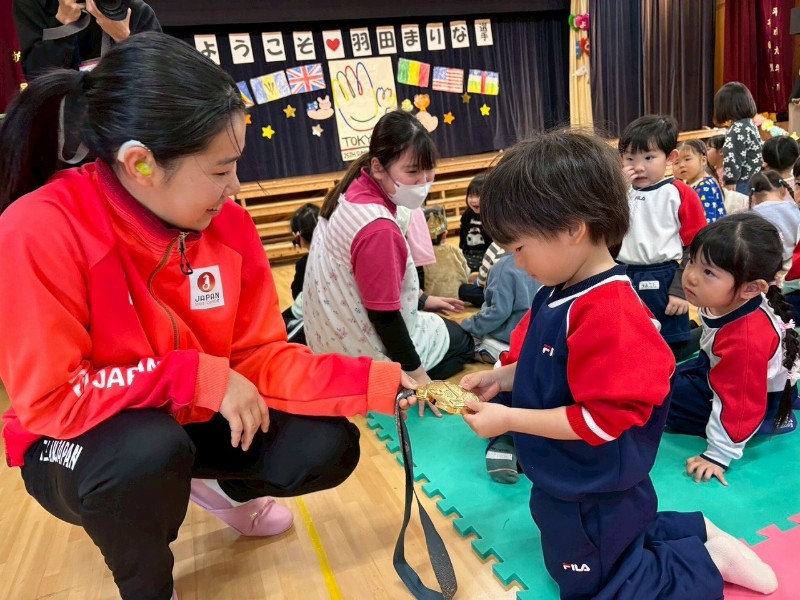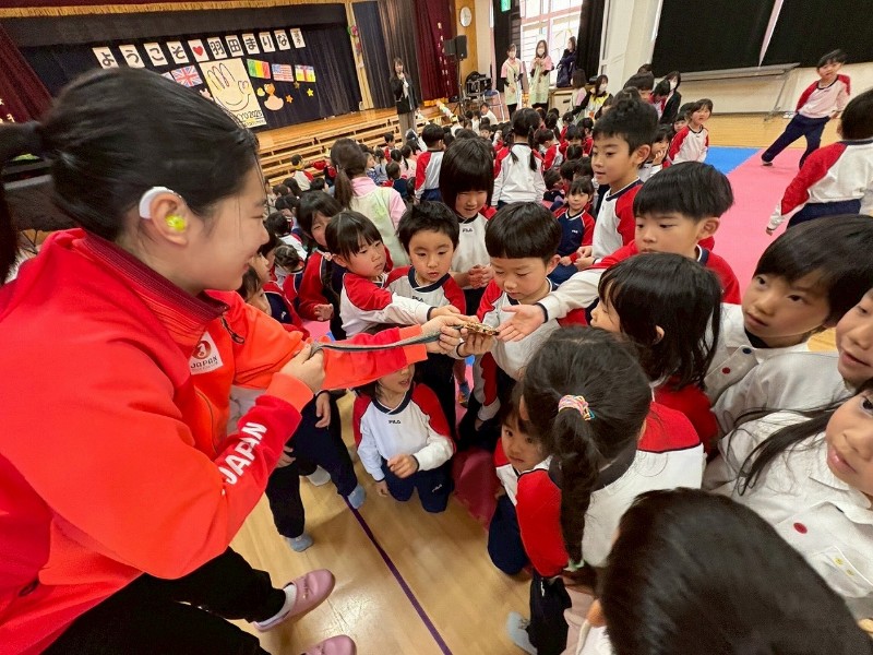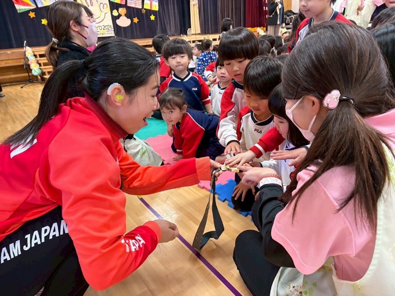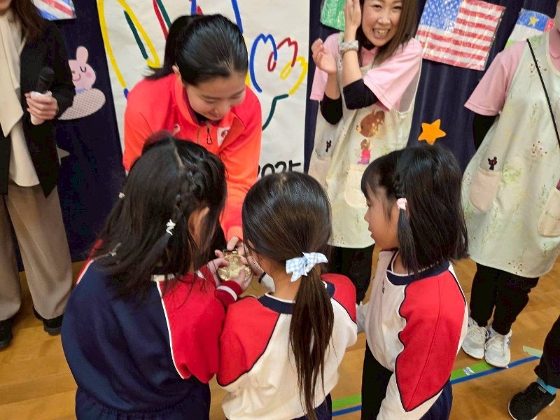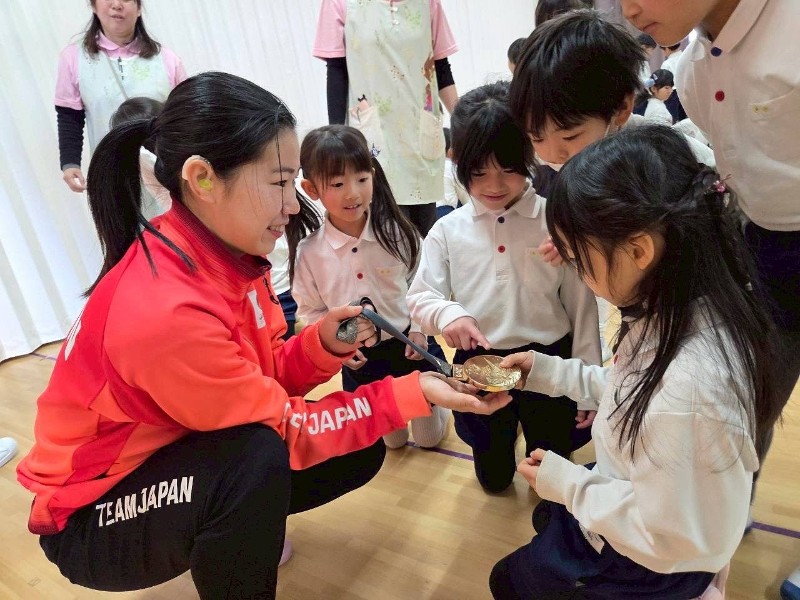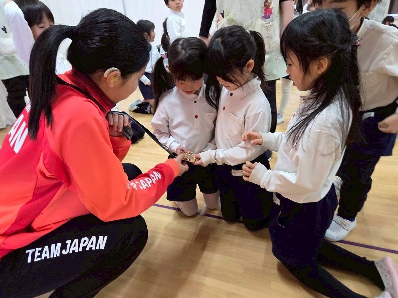 「金メダル おめでとうございます!!」重たい金メダルを持って、幼稚園へ来園くださいました。初めて目にして、手に取って見せていただいたメダルの重さに驚きでした。