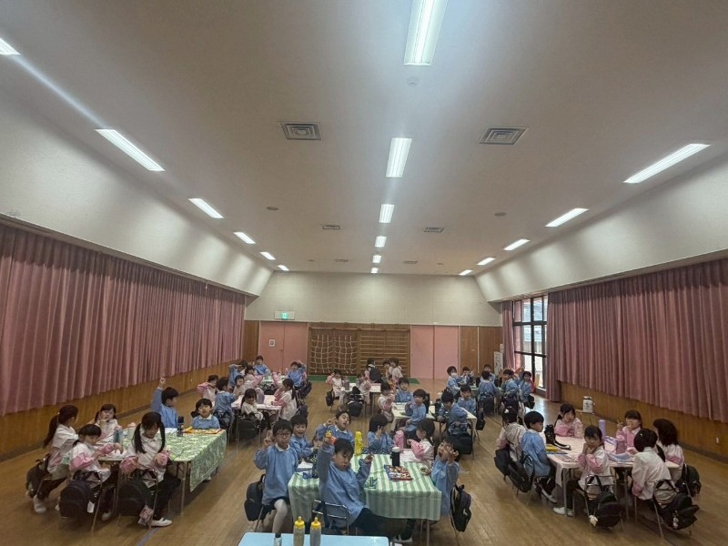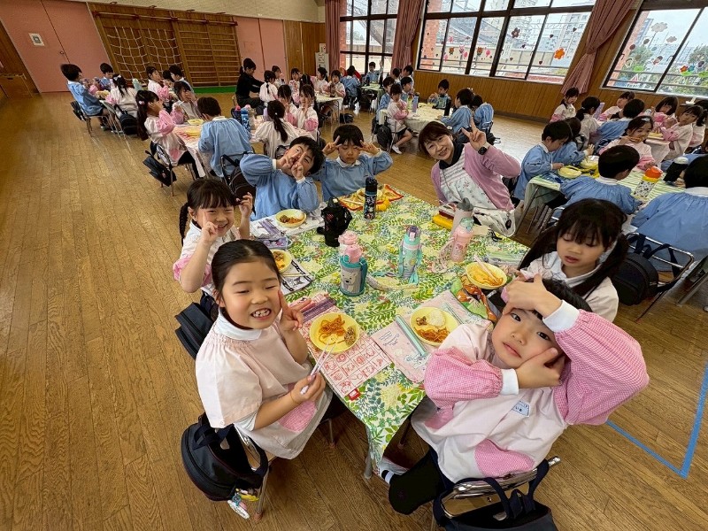最後の給食は、2クラス一緒に!そしてそれぞれが好きなものを選んでのオードブル式給食☆先生方からのサプライズは、カーテンをオープン!!子どもたちが楽しめるようにと、窓全体に絵を貼ってくれており、楽しい雰囲気がアップ。そして、担任の先生方による「カリスマックス」の踊り☆派手なアフロにサングラス姿に大爆笑の子どもたち。楽しい、楽しいランチタイムになりました♡